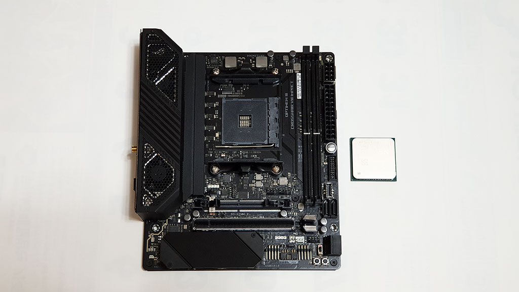 이 제품을 사용해보기 위해 메인보드도 좋은 녀석으로 준비해 보았다. ASUS Crosshair VIII impact 이다. 왠지 Mini-ITX 보드 규격처럼 보이지만 이 메인보드의 규격은 Mini-DTX 이다.