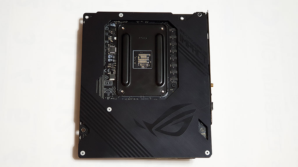 메인보드 뒷면에 풀사이즈의 알루미늄 백플레이트가 탑재되어 있으며, ROG 로고 및 제품명이 양각처리 되어있어 고급스러움을 더했다.