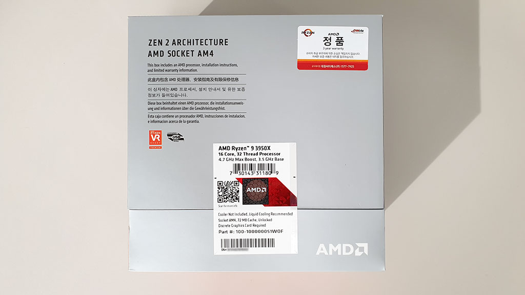 라이젠 9 3950X 박스 이미지이다. 이 각도로만 보면 라이젠 9 3900X와 차이가 없어 보인다. 하지만 쿨러가 동봉되지 않기 때문에 3900X 박스의 절반 크기로 되어있다.
