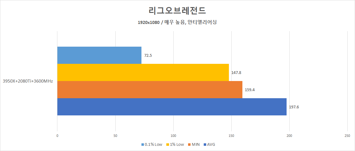 국내 최고 인기 게임은 리그오브레전드 벤치마크 결과이다. 비교군에 대한 언급은 할 수 없지만 평균부터 0.1% 까지 전반적으로 우수한 결과가 나왔다. 사실상 200프레임 근처를 유지했기 때문에 게임성능에 대해 크게 논할 부분은 없다.