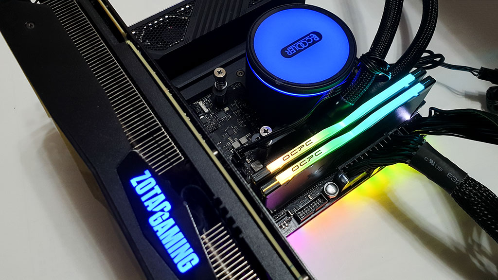 3950X의 발열을 충분히 해소해 줄 수 있도록 3열 수냉 쿨러인 PCCOOLER GI-CX360 ARGB를 장착했다. 이 쿨러는 5년 누수피해를 보장하고 있어 최근 일부 일체형 수냉쿨러에서 발생하고 있는 누수가 발생하더라도 장기간 손해 보상을 받을 수 있다. 5년의 서비스를 위해서는 제품 구입 후 공식 홈페이지에서 제품을 등록해야 한다. ARGB 적용 제품 중에서는 가격도 10만원대 초반정도로 합리적이다. 메모리의 경우는 라이젠 성능을 충분히 끌어낼 수 있도록 OCPC의 X3Treme Aura DDR4 8GB x2 3600MHz 제품을 사용했다. 라이젠의 경우 메모리 클럭이 인피니티패브릭에 영향을 주기 때문에 고성능 메모리를 사용하면 더욱 높은 성능을 낼 수 있다.