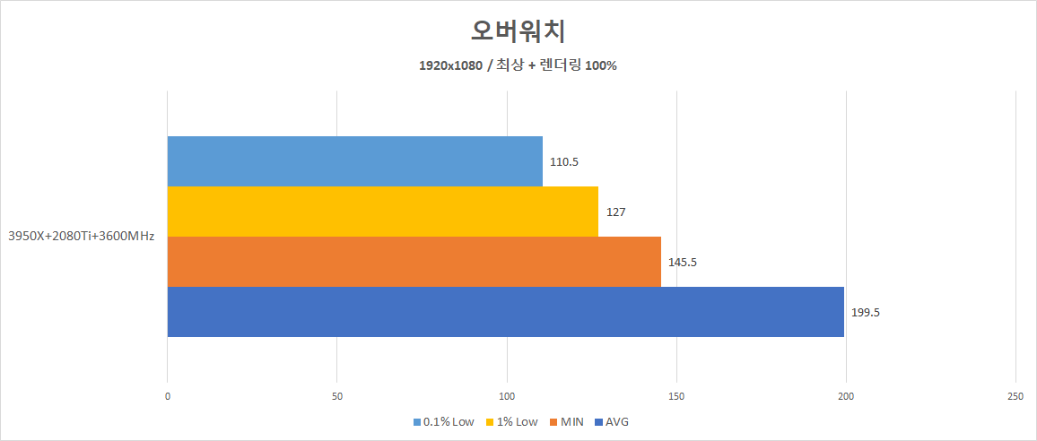 오버워치의 경우 최상 옵션으로 설정하여 테스트 했음에도 144 프레임 이상을 꾸준히 유지했다. 평균은 거의 200프레임 수준으로 게이머에게 충분한 만족을 주리라 생각된다.