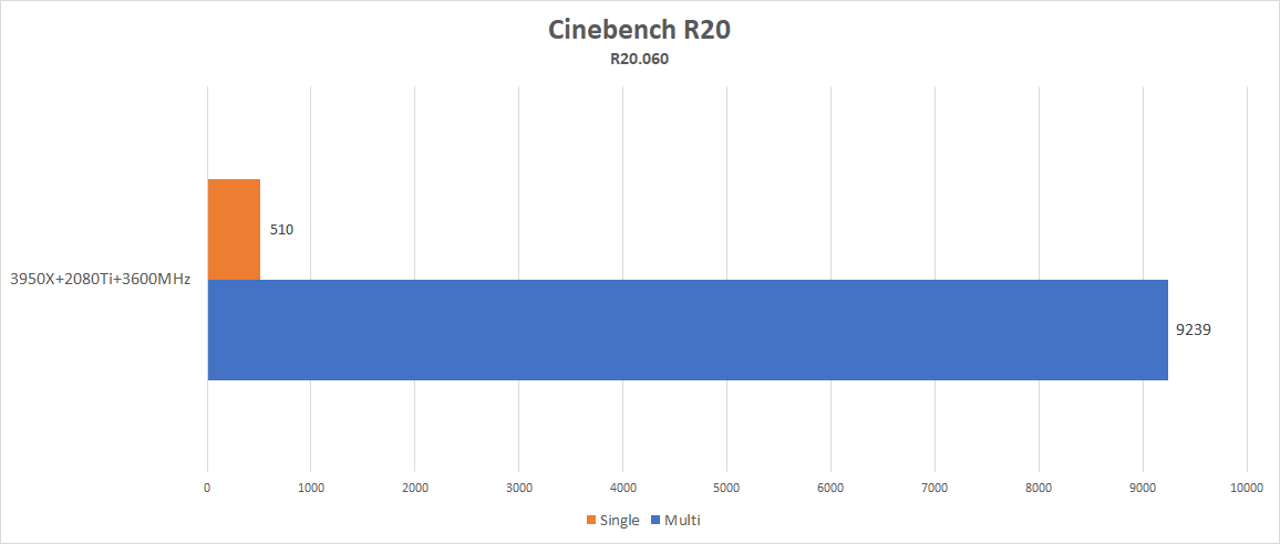 Cinebench R20 기준의 성능 측정이다. 일반 데스크탑 CPU에서는 절대 볼 수 없었던 멀티코어 기준 9천점을 훌쩍 넘기는 스코어를 기록했다. 싱글코어 성능도 510 점으로 상당히 준수한 편이다.