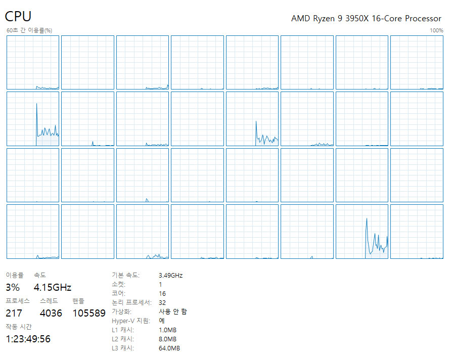 실제로 작업관리자를 켜서 논리 코어를 확인해보면 32개의 모눈종이 같은 모습은 상당한 만족도를 제공한다.