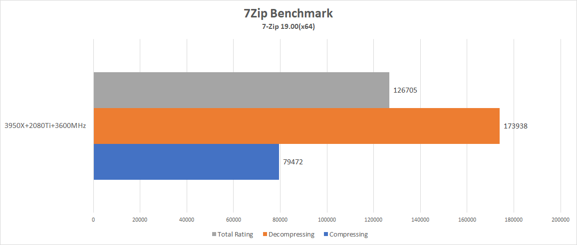 압축 프로그램인 7Zip에 포함된 벤치마크 기능을 사용해 압축 및 압축해제에서 어느정도의 성능을 보이는지 확인해 본 결과 압축은 126705MIPS, 압축 해제는 173938MIPS, 전체 평가는 126705MIPS를 기록했다. 멀티코어 및 스레드를 충분히 지원하는 압축 소프트웨어답게 코어수/스레드 수가 많은 3950X의 성능을 충분히 끌어낸 결과라고 볼 수 있겠다.
