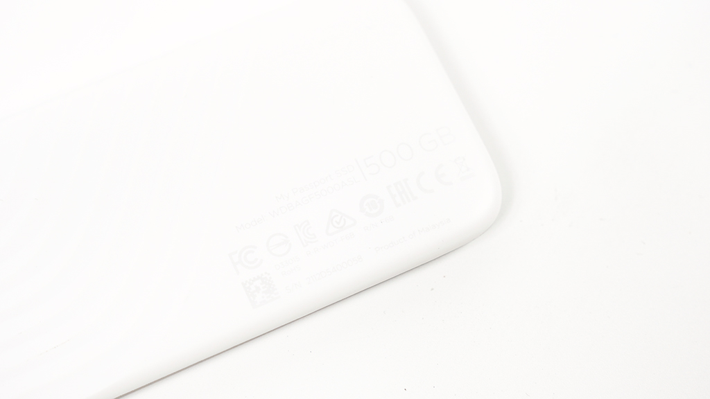 제품 뒷면은 흰색이며 500GB 용량, 제품 모델명, 각종 인증 여부, 제조국 등이 인쇄되어 있다.